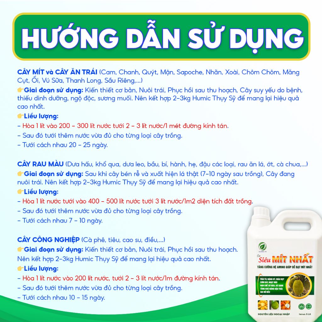 - Hòa 1 lít vào 200 - 300 lít nước tưới 2 - 3 lít nước/1 mét đường kính tán.