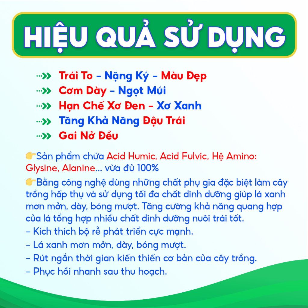 Sản phẩm chứa Acid Humic, Acid Fulvic, Hệ Amino: Glysine, Alanine... vừa đủ 100%
